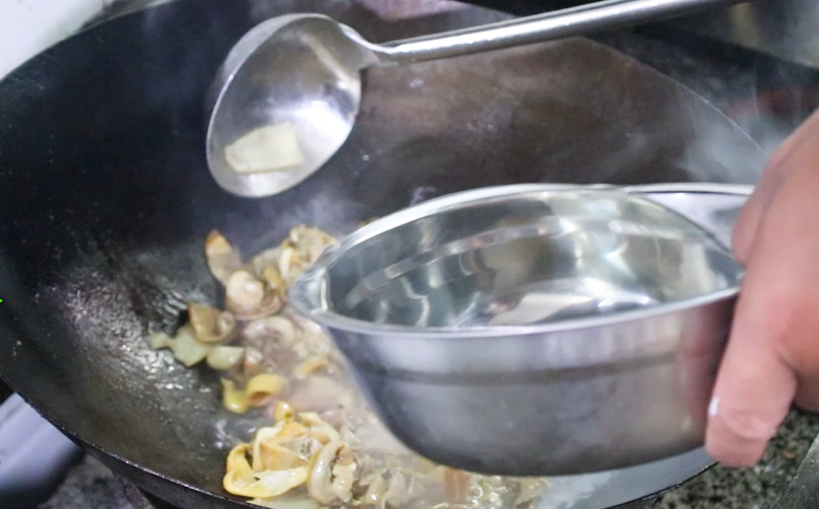 8、河蚌肉炒香后加入清水。