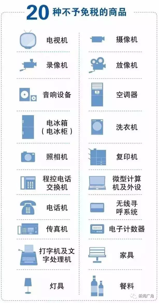 电视机、摄像机、录像机、放像机等,20种商品不予免税。
