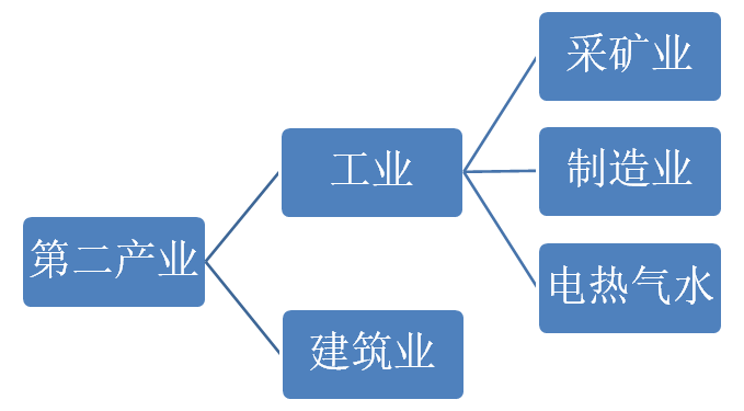 工业是对自然资源的开采、采集和对各种原材料进行加工的社会物质生产部门,从定义来看,工业包括B、C、D三大行业[2],加上建筑业(D)构成第二产业。于是,第二产业、工业、建筑业三者之间的关系如下图:
