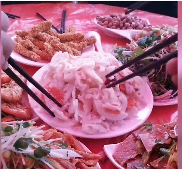 从视频中能看到,一盘凉拌的莲藕已被冻成了“冰雕”,莲藕上面还有一层冰霜,众人用筷子夹不动、扒拉几下也没弄开。其它几个菜也是如此,都冻得硬梆梆的。无从下嘴,大家都在那里笑,后来菜都被大家打包带走了。