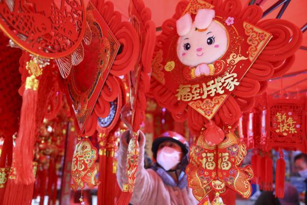 ↑1月16日,市民在湖南省邵阳市隆回县桃花坪街道朝阳路一家文体店选购兔元素新年饰品。新华社发(曾勇 摄)