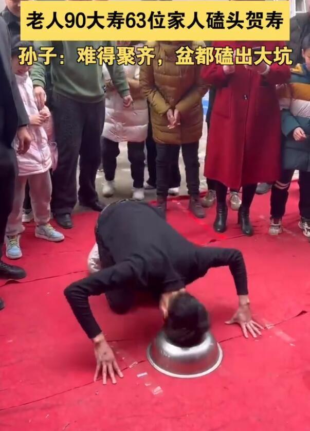 家人们布置好了生日现场,还用红地毯铺地,还准备一些吃的,还准备了老人的位置,让老人坐着,然后家里人一个一个给她送上祝福,孙子辈都给奶奶磕头,孙子辈一个一个上前去给老人磕头,祝福老人生日快乐,现场家人比较多,为了活跃气氛,很多人磕头磕得特别响,把铁盆都磕出大坑,老人看到这样的情景,心里十分开心,还给孙子辈一个一个发红包,一家人也十分开心,都在为老人庆祝生日。