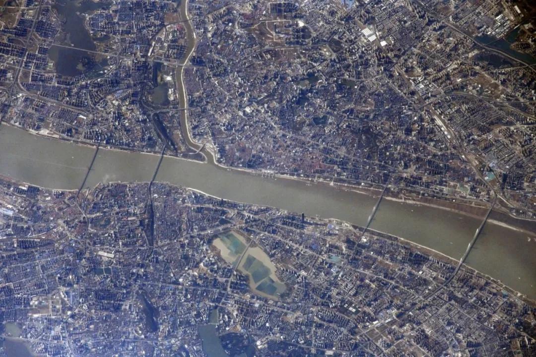 从这张武汉市的太空航拍照中看到,长江、汉江一目了然,两江上的大桥清晰可见。