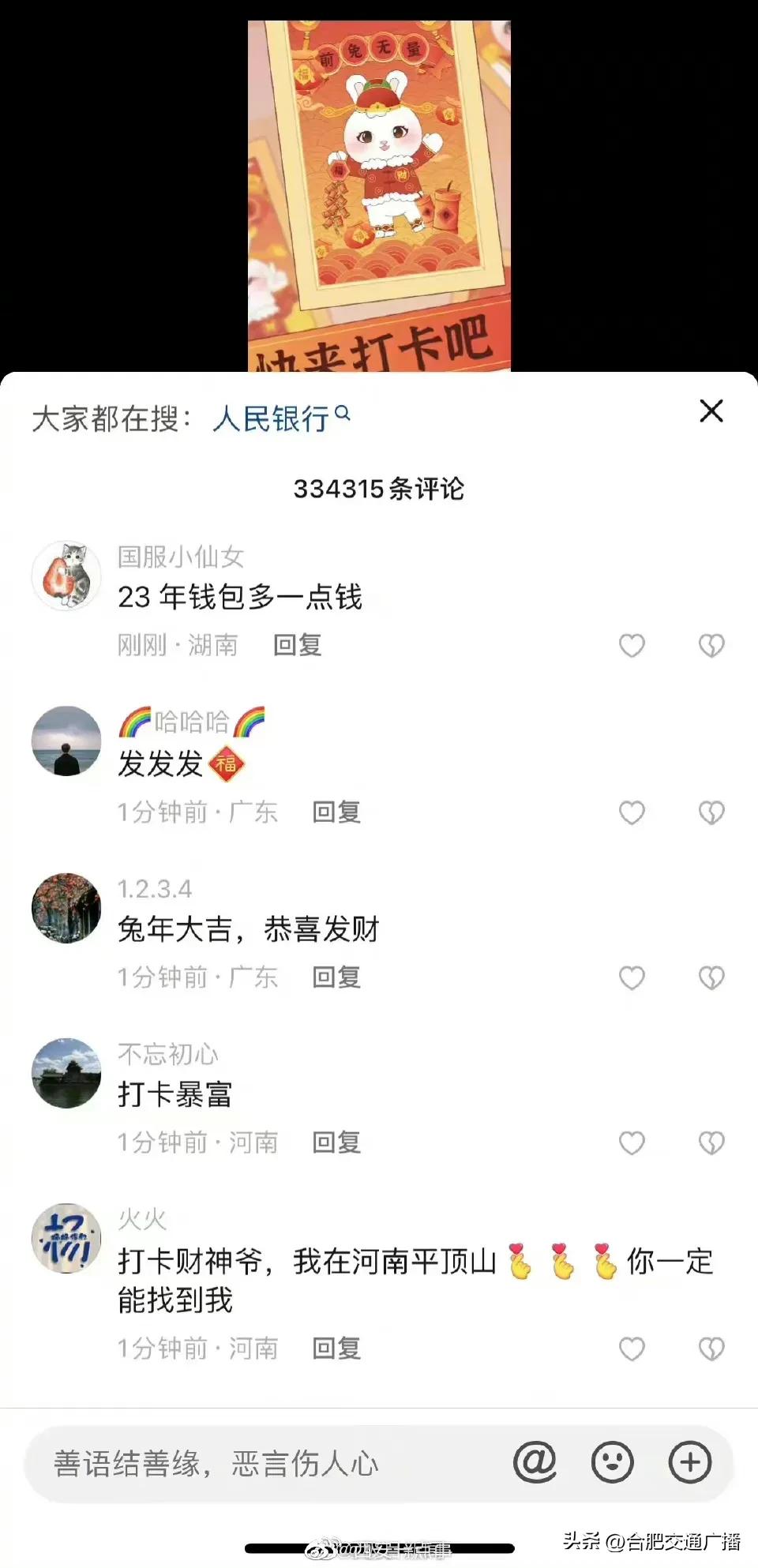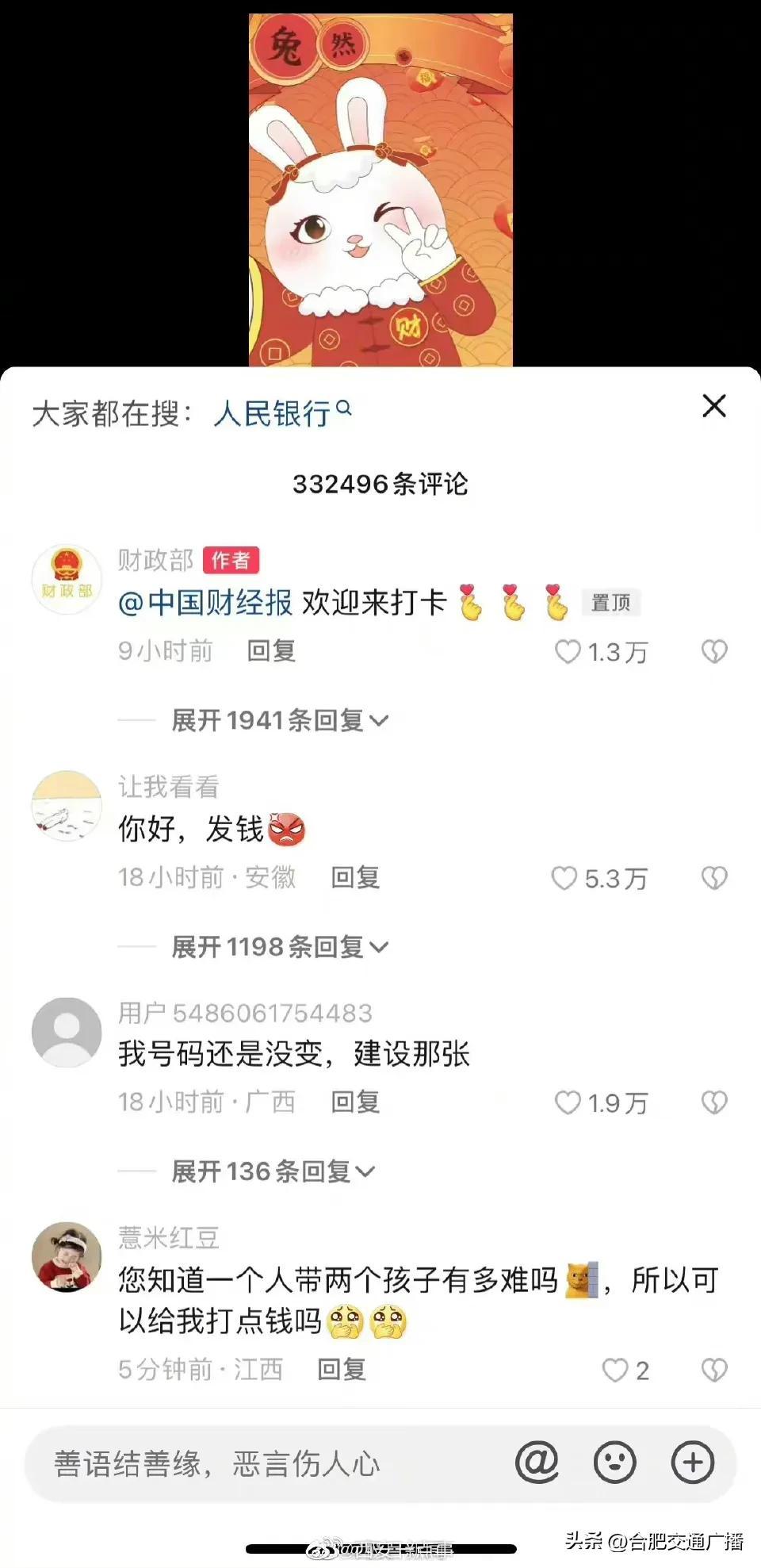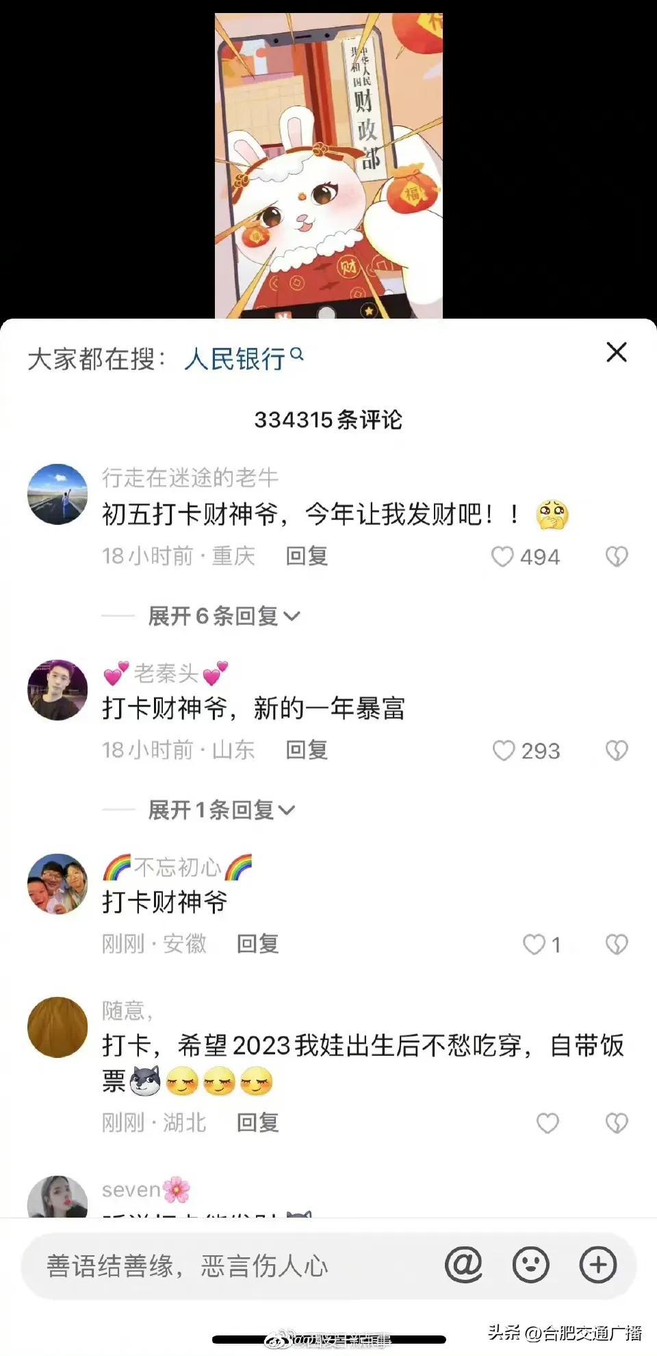 大年初五财政部账号成网友打卡地(网友纷纷给“真财神爷”花式留言) 2023-01-26 热点新闻 10910 作者:网友投稿 今天(1月26日)正月初五,是很多地方“迎财神”的日子。财政部在今天发了一条“都来打卡财政部”的动画短视频,引来网友们的点赞和转发,祈求新年“财运亨通”。