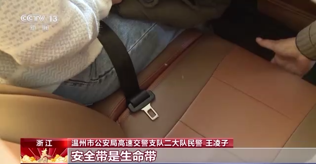 温州市公安局高速交警支队二大队民警 王凌子:春运以来我们高速交警加大了对车辆的检查力度,在我们(检查)工作中发现(轿车)后排的乘员使用安全带的频率,往往要低于前排副驾座的安全带使用频率。我们所说的安全带是生命带,前排后排都要使用安全带,车辆一旦发生碰撞以后,安全带(可以)将你的伤害降到最低。
